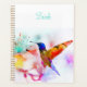 Colourful daily planner, with watercolor graphics of an abstract hummingbird and flowers. Personalise the aqua custom text for yourself or as a great gift idea for her.