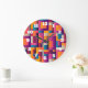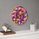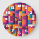 A clock with a colourful abstract background. Bold and exciting colours - pink, blue, orange and more.