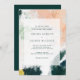 This colourful abstract wedding invitation is perfect for your unique modern boho wedding. Hand-painted with textured brush marks of dark emerald green, peach, and mustard, all overlayed with a minimalist transparent square, it's sure to give your occasion a simple yet rustic bohemian feel.