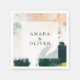 These colourful abstract wedding napkins are perfect for your unique modern boho wedding. Hand-painted with textured brush marks of dark emerald green, peach, and mustard, all overlayed with a minimalist transparent square, it's sure to give your occasion a simple yet rustic bohemian feel.