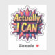 Bring the bold vibes with this colourful Actually I Can sticker in a fun comic-inspired style. Perfect for laptops, water bottles, planners, notebooks, or phone cases. Printed on durable glossy vinyl with vivid colours that pop. A great little daily boost for go-getters and dreamers alike. Stick it somewhere you will see it and remind yourself — Actually, you CAN.