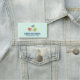 A name tag with a trio of cute and whimsical hand-drawn birds. 2 of the birds are standing together with some tiny green pine trees in between their feet. Another blue bird is flying up in the air between them.
