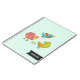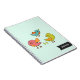 A spiral notebook personalised with your name inside a black ribbon image. Designed with a trio of cute and whimsical hand-drawn birds. 2 of the birds are standing together with some tiny green pine trees in between their feet. Another blue bird is flying up in the air between them. Mint green background.