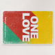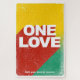 Fun and colourful "One Love" message reggae rasta poster, with the colours yellow, red and green printed on a white background.