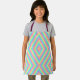 "Colourful apron with a vibrant geometric pattern of concentric diamonds in shades of blue, green, pink, and yellow. Displayed on a plain background and worn by a smiling person in a grey sweater."
