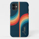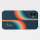 Retro style double arches geometrical pattern illustration with turquoise, blue, red and beige stripes decoration on dark blue background. Add your name/monogram or delete the text.