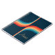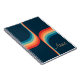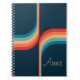Retro style double arches geometrical pattern illustration with turquoise, blue, red and beige stripes decoration on dark blue background. Add your name/monogram or delete the text.