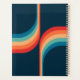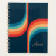 Retro style double arches geometrical pattern illustration with turquoise, blue, red and beige stripes decoration on dark blue background. Add your name/monogram or delete the text.