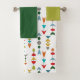 This towel set has a camo-green washcloth, a green hand towel, and a bath towel with a mid-century modern design of arrows made from black lines and different shapes in retro colours of red, blue, green, orange, gold, and grey on a field of white. Want the same design with different colours? Message me.