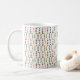 This mug has a mid-century modern design of arrows made from black lines and different shapes in retro colours of red, blue, green, orange, gold, and grey on a field of white. Want the same design with different colours? Message me.