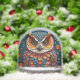 Vivid and intricately designed owl sculpture featuring vibrant colours and detailed floral elements, creating an artistic and whimsical nature-themed decorative piece.