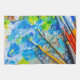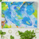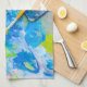 Image of a colourful painting palette, a number of brushes and a palette knife. Blue and green colours prevail. Beautiful vibrant one-of-a-kind kitchen or hand, or feet towel for anyone.