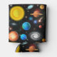 Original fine art design of planets, sun, moon, stars, nebulae and more by artist Carolyn Mcfann of Two Purring Cats Studio printed on a quality beverage can cooler.