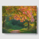 A photograph of a vibrant maple tree standing in a forest clearing. The tree’s leaves are transitioning from bright green to fiery shades of red, orange, and yellow, catching the golden light of the late afternoon sun. A gently winding path, covered with fallen leaves, leads into the background of the image, lined with blurred silhouettes of other trees. Soft sunlight filters through the canopy, creating dappled shadows on the forest floor.