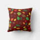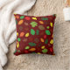 This modern throw pillow features an autumnal pattern with various leaves yellow, orange, red, and brown hues on a burgundy background.