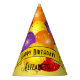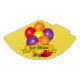 Colourful balloons with confetti are centred on this conical paper party hat with template text as part of the design over a yellow background. Fill in the template fields with your celebration and name, remove the name or click customise to select a typeface style, colour, and size you like.