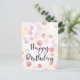 Colourful Happy Birthday Card with pink, purple, yellow, lilac balloons/bubbles. The 'happy birthday' font has pink shadow and pink dots that really make it pop! The back of the postcard has a pink border around the edge.