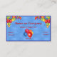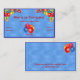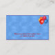 Multi coloured balloons frame this business card on the top left and right while a smaller group of balloons is set down low in the centre. Card has a dark blue border and the text is in a fun red font. Obverse of the card has a small set of balloons to the upper left.
