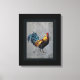 A colourful painting of a bantam rooster on a grey granite background. This rooster has exotic and colourful feather patterns. A bright red comb and a beautiful tail made of blue feathers.