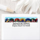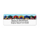 A row of multicolor beach homes or huts on a white sand beach. Personalise these summer theme labels with your name and address.