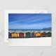 A colourful row of Beach Huts: blue, yellow, red and green by the sea.