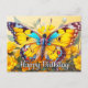 This delightful birthday postcard showcases a whimsical illustration of a butterfly in flight. You are invited to add your message on the reverse side of this postcard.