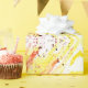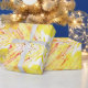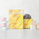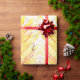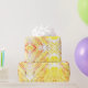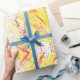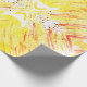 Colourful birthday wrapping paper for holiday party featuring an abstract watercolor painting I did with a warm colour palette of vibrant yellow, orange and red, plus some whimsical black dots.