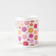 Colourful flower pattern in yellow, orange, pinks, lilac and reds on a cream colour background.