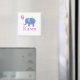 A feminine white kitchen magnet with your name is set below an image of a blue baby elephant dotted with colourful yellow, green, orange and purple flowers. The ear of the elephant is blueish grey and it has a black expressive eye. The baby elephant holds one purple balloon in its trunk. Your name personalises the design and is set with elegant purple font below the image.