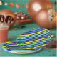 Paper plates featuring a colourful blue green and yellow stripes pattern. These plates are great for any celebrations.