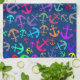 Decorative boat anchor pattern in many colours, sizes and angles. Custom kitchen towels. Blue background.