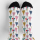 These cute Holiday themed socks have a repeating pattern of boho style Christmas trees in various colours and patterns. The images are placed on a white background. Festive, bright, and colourful!