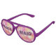 Fun bridesmaid's purple party glasses with the lens done in pink, yellow, and coral, with purple custom text reading, BRIDESMAID. Great for the bachelorette party.