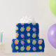 A modern and colourful Hanukkah gift wrapping paper featuring colourful bright star of David twirling dreidels on a solid rich deep blue background.