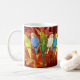 A beautiful drawing of a line of perching budgies with tropical red leaves behind.