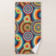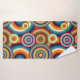 This towel set has a pink washcloth, a purple hand towel, and a bath towel with a Bauhaus design of different groups of concentric circles in 1970s colours.