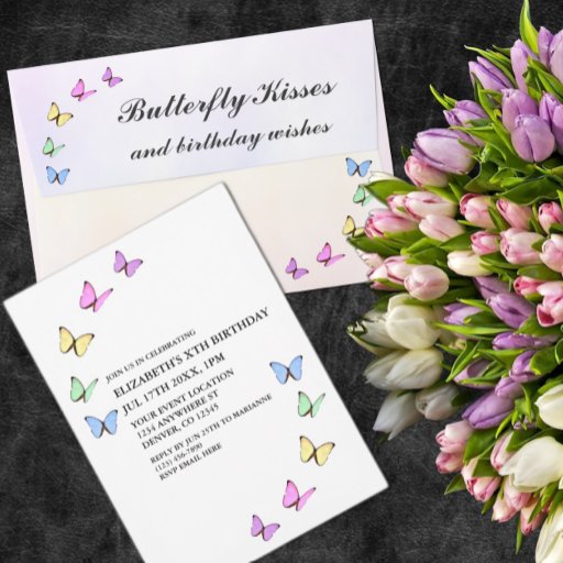 Butterfly kisses and birthday wishes collection with colourful butterflies and minimalist script typography