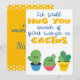 This colourful greeting card features three fun cartoon cactus on a white background. The caption, in calligraphy blue and all caps yellow fonts, reads I'd still hug you even if you were a cactus.