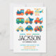 HONK, BEEP, VROOM TRANSPORTATION BIRTHDAY THEME. RED GREEN AND BLUE CUTE COLORFUL VEHICLES INCLUDING CAR, TRAIN, HELICOPTER, GARBAGE TRUCK, BUS AND POLICE CAR. EDITABLE KIDS BIRTHDAY INVITATION