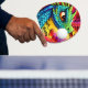 Fun ping pong paddle, with colourful graphics of a cartoon dragon head. Personalise the custom text to read what you want.