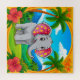 A cheerful cartoon elephant standing in a vibrant tropical setting featuring colourful palm trees, blooming hibiscus flowers, and a sunny backdrop, creating a lively and joyful atmosphere.