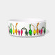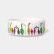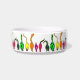 This is a heavy, durable bowl decorated with Tibbies of many colors, the perfect size for hungry/thirsty Tibs. The design is interesting and printing clear.