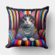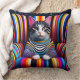 Cat with colourful stripes sitting in a chair with colourful stripes.