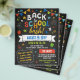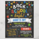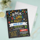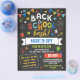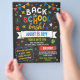 Back to school bash flyer with a printed chalkboard look, chalkboard fonts, and chalkboard doodles filling the invitation for a fun and colourful look in strong and eye catching colours.