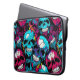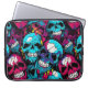 colourful and chaotic pattern of skulls. The skulls are mostly blue with various shades of pink and purple splatters and drips. Some of the skulls have cracked teeth and broken bones, adding to the gruesome and macabre nature of the image. The background is black, which helps to highlight the skulls and make the colours pop.
