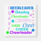 Fun and colourful cheerleader's locker magnet. Colourful graphic text in many different fonts spell out, Cheerleader, Cheer, and Cheering, in a square design. Great for at home or school.