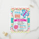 Fun, Cute butterfly, spring flower theme children's, girl's birthday party invite on bright colourful girly chevron pattern. Features blue and pink butterfly and pink and yellow flower on orange, lime green, teal, coral, white, and aqua turquoise chevron stripes. One and 1st birthday can be personalised to other birthdays for toddlers, kids, or babies, baby.