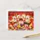 Bright, colourful Chinese New Year postcard with dragons, people with red envelops, lanterns, and firecrackers.