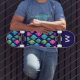 Bring a colourful flourish to your skateboarding sessions, with this bright and festive skateboard. With a pattern of Christmas ornaments in pink, blue and green on a midnight blue background, this board is sure to shine at the skate park. The board can be personalised with an initial as an elegant monogram, and makes an ideal holiday gift.