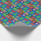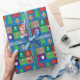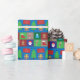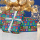 A wrapping paper designed with some Christmas symbols on a colourful square background. Merry Christmas!